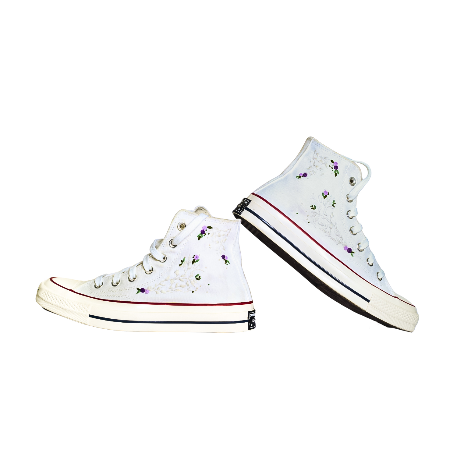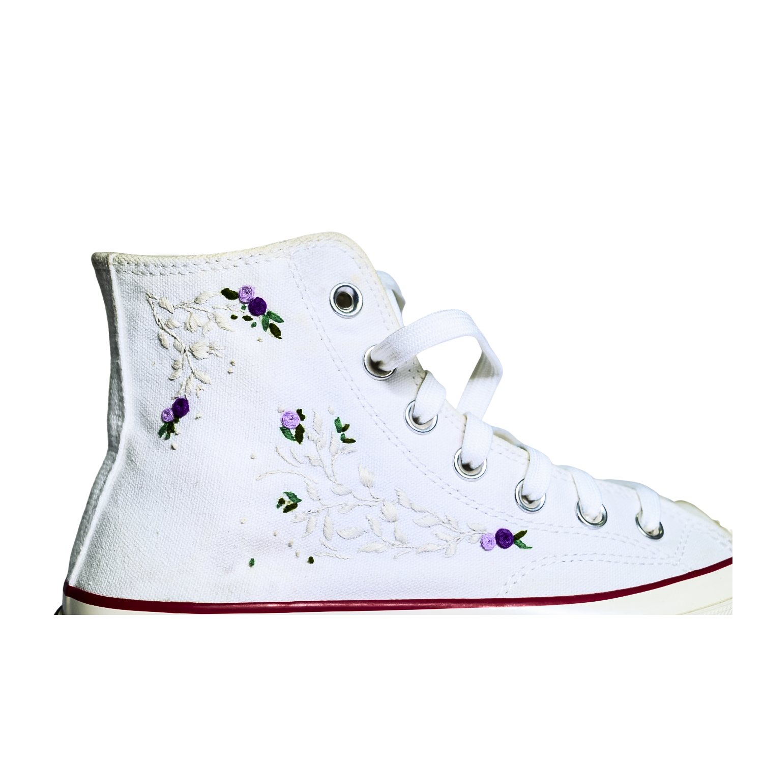 Hand-embroidered on premium white canvas sneakers, this pair features delicate lavender and violet roses entwined with soft white leafy vines.