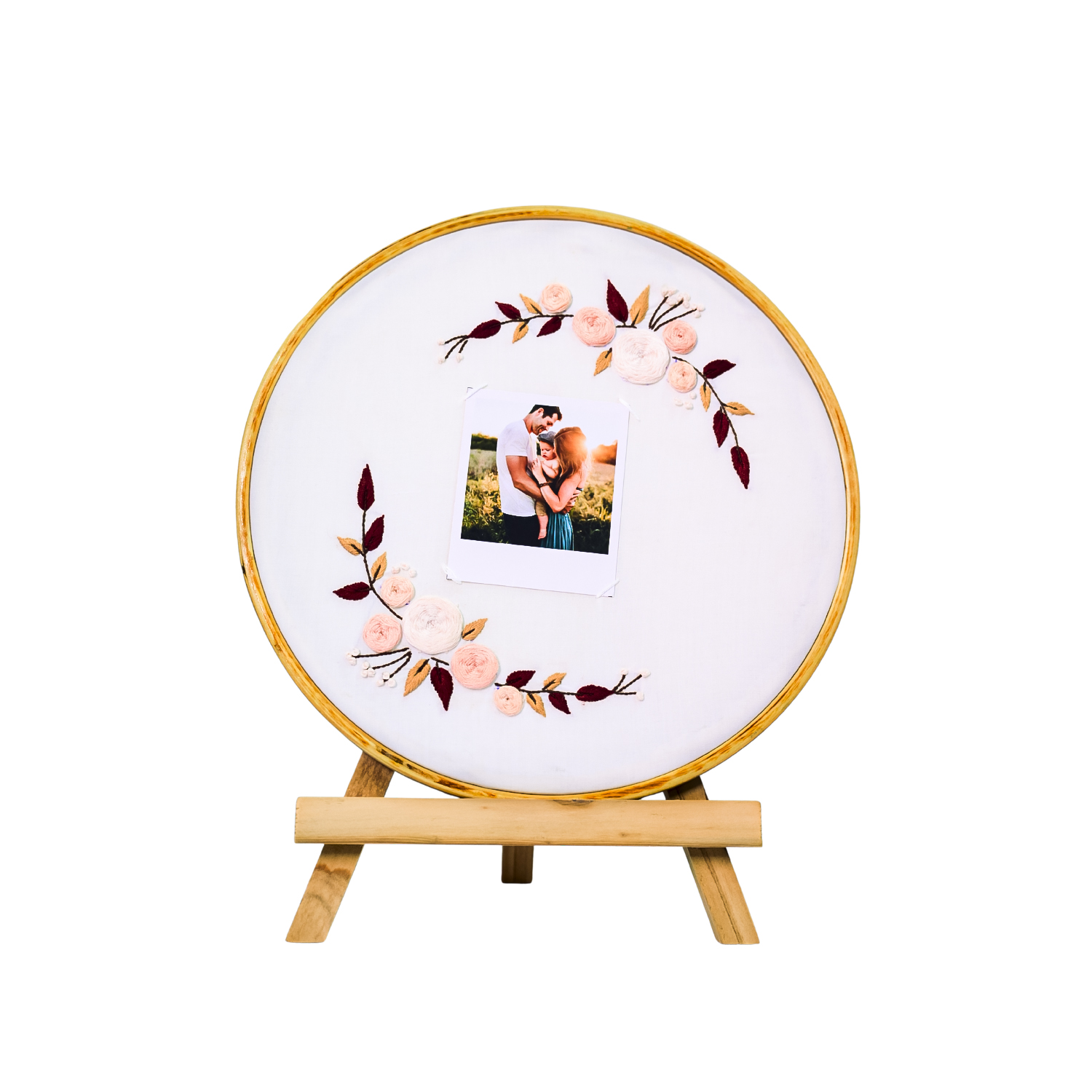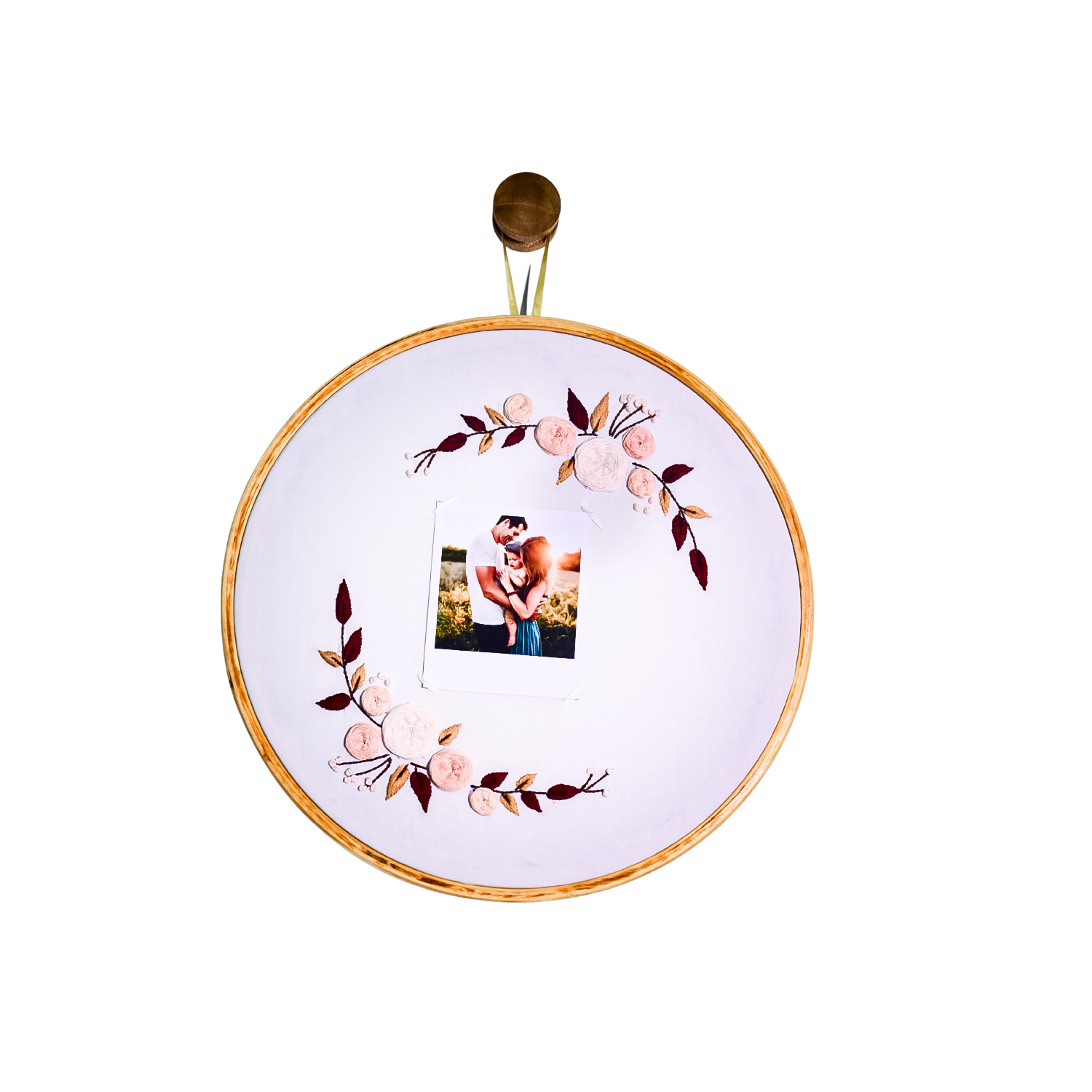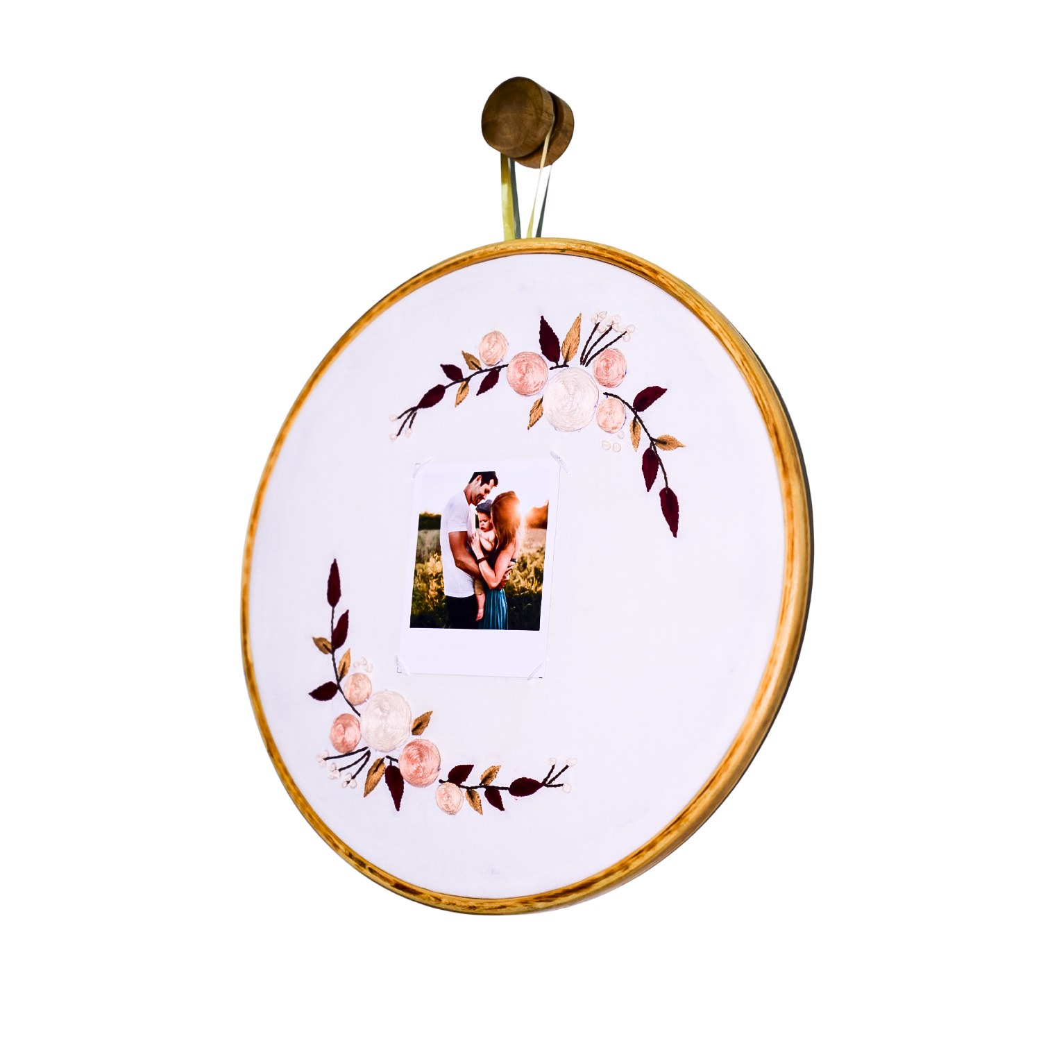 Meadow Whispers – a personalized embroidered hoop from Raya’s Threaded Memories collection. 10-inch hoop with blush pink florals and burgundy leaves framing your Polaroid photos. Photo-only design (no text customization). Includes a wooden hook.