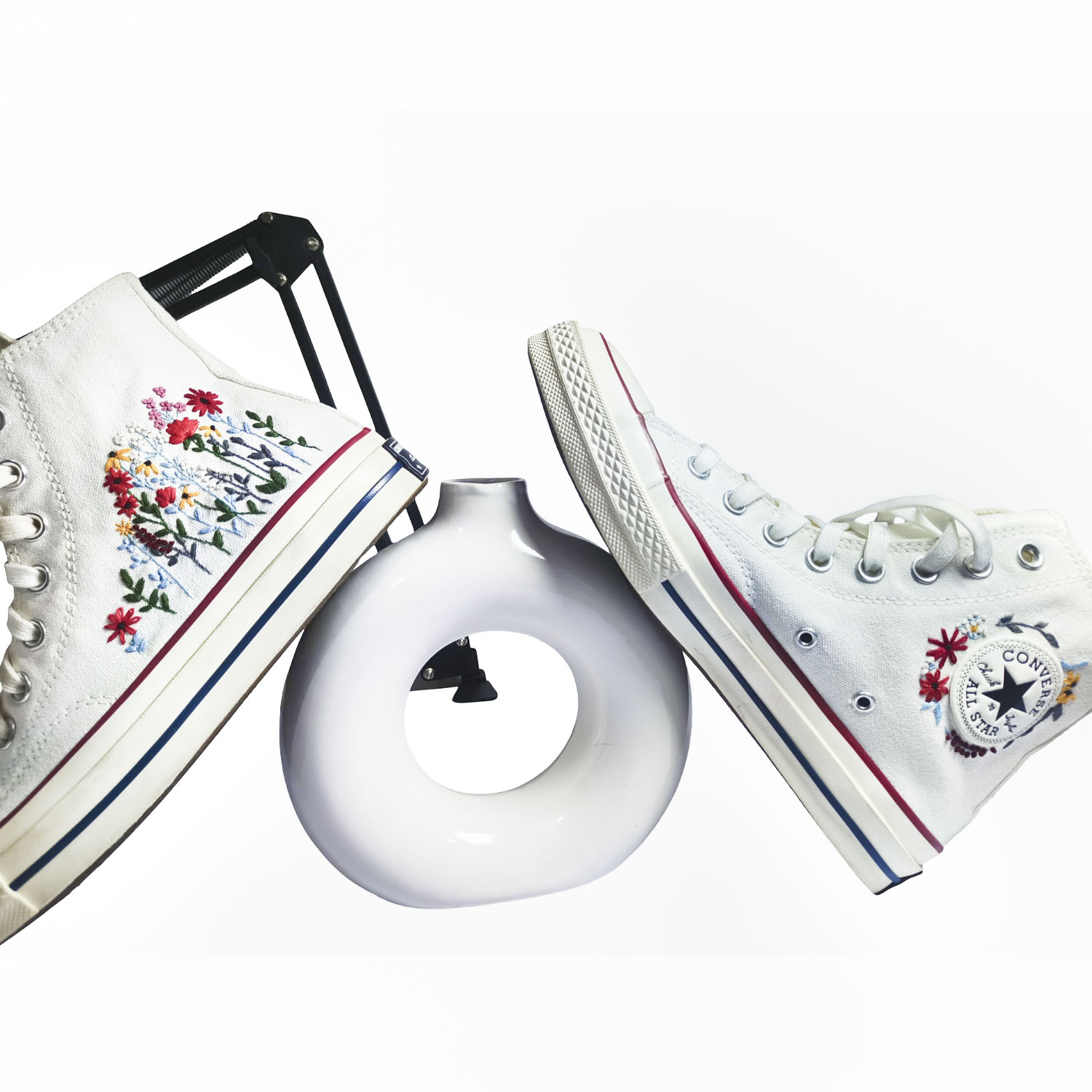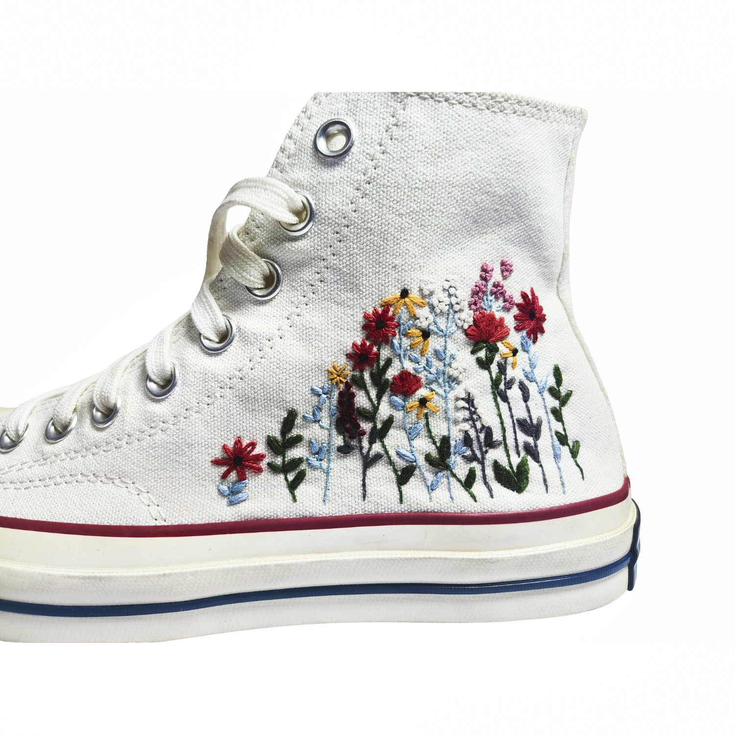 A blooming garden of hand-stitched wildflowers on classic white Converse. Made-to-order, artistic footwear for dreamers and creators.